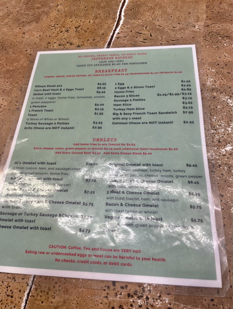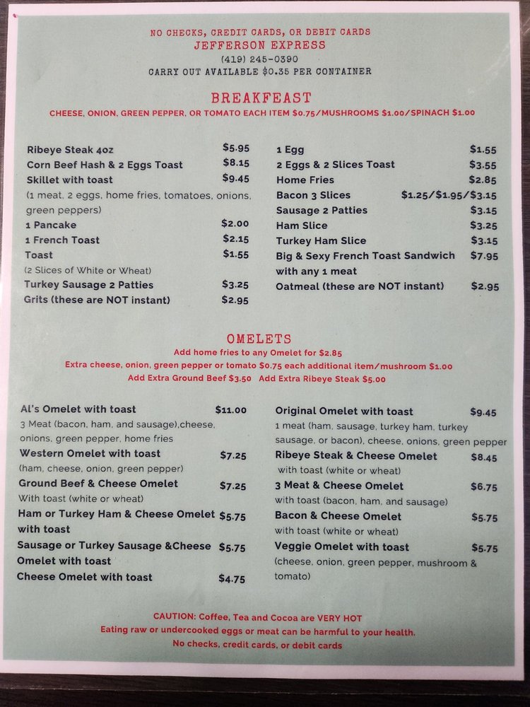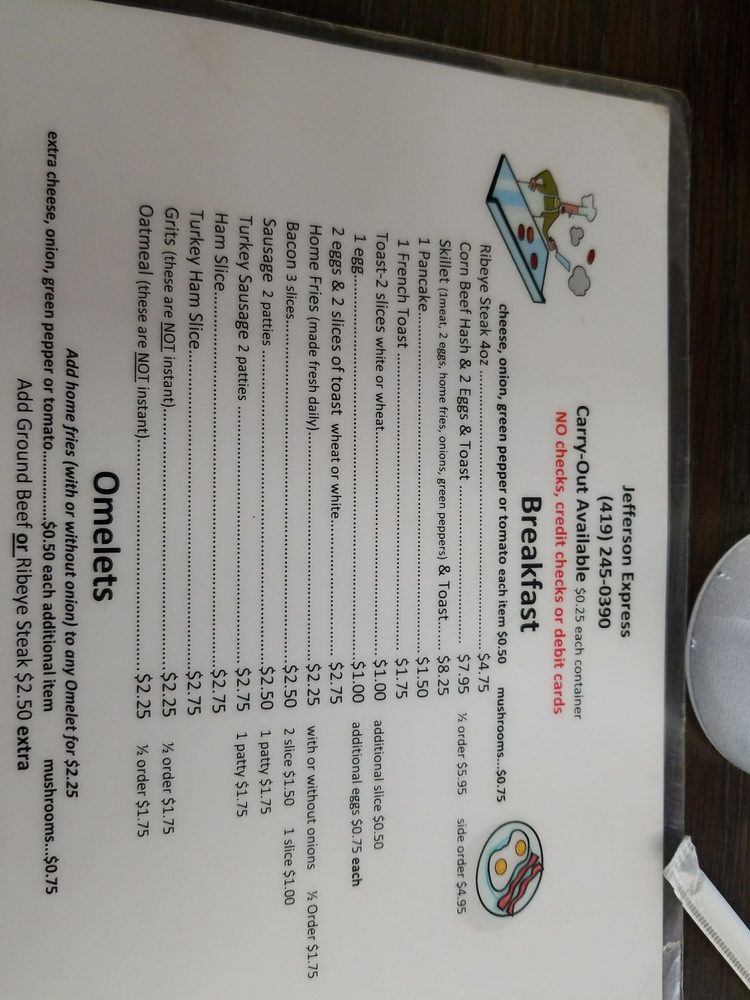 Jefferson Express, located at 1217 Jefferson Ave Toledo, OH 43604, is a cash-only diner known for its good and cheap piping hot food. With a focus on authenticity, this diner offers a wide range of options for vegetarians and provides a welcoming atmosphere for groups and kids. Customers rave about the delicious and fresh food, highlighting the fast service and reasonable prices. From breakfast to casual meals, Jefferson Express is a favorite among locals and visitors alike. With a private parking lot and TV for entertainment, this diner is the perfect spot for a quick and satisfying meal. Experience the charm and flavor of Jefferson Express for a memorable dining experience in Toledo.